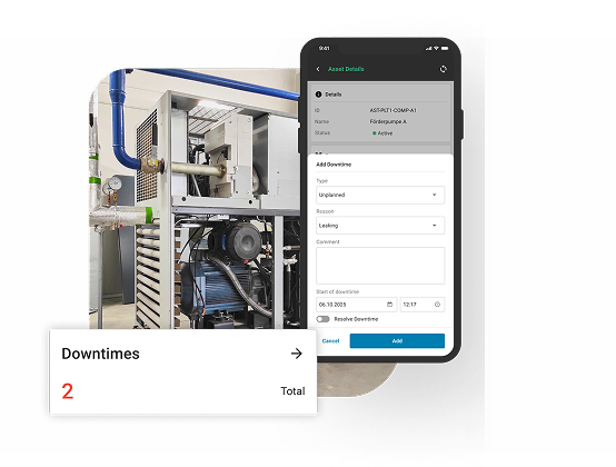 Define uniform categories for planned and unplanned downtime in the settings and record downtime directly on the respective asset page – this ensures that reports remain fast, consistent, and comparable.