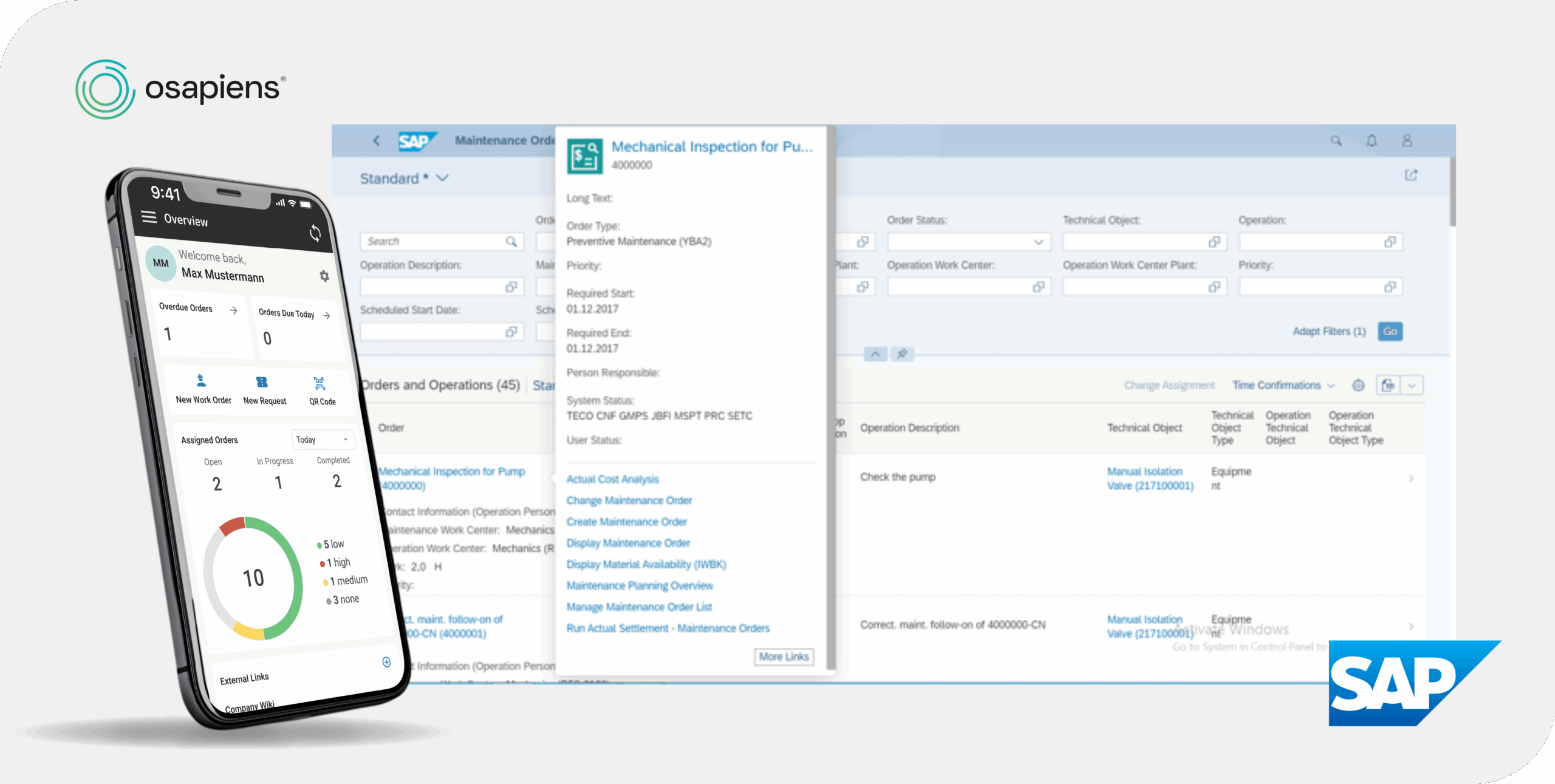 - SAP-zertifizierte Integration ohne Medienbrüche: osapiens synchronisiert automatisch alle Daten mit SAP PM, von Arbeitsaufträgen bis zum Materialverbrauch, ohne doppelte Eingaben.